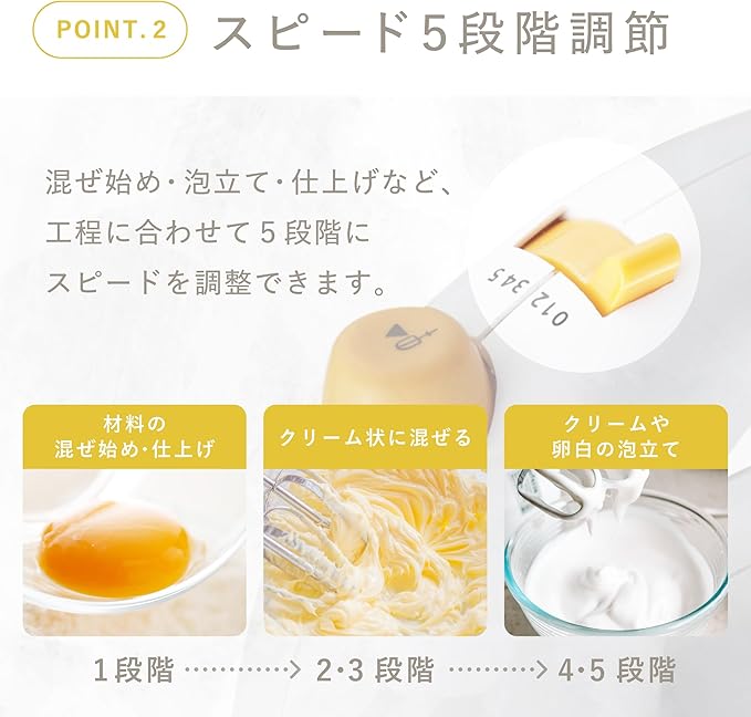 スピードが5段階も切り替えができるうえ、ビーターはワンプッシュで取り外しできる、とても使いやすいアイテム。