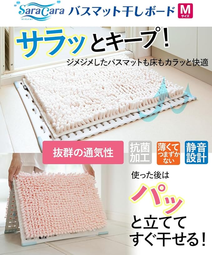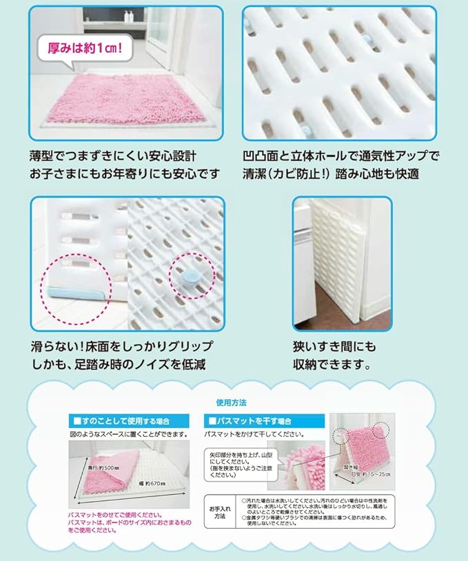 バスマットのすのことして使った後は、パッと立ててすぐ干せる。ジメジメマットがそのまま干せる。 抜群の通気性。凹凸面と立体ホールが通気性アップの秘密。 約45 65cmまでのバスマットがぴったり収まります。使わない時は狭いすき間にも収納できます。