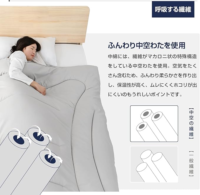 【中空構造のポリエステル綿】「中空ポリエステルわた」を採用しているので、繊維一本一本に空気をたっぷり含みますので、保温性にすぐれ、ほこりもでにくくなります。ふわっと暖かくて体への負担を感じさせません。通年使う布団に最適な素材です。ズレ防止用ループが付いているので、お布団がズレる心配もありません、とても便利です。