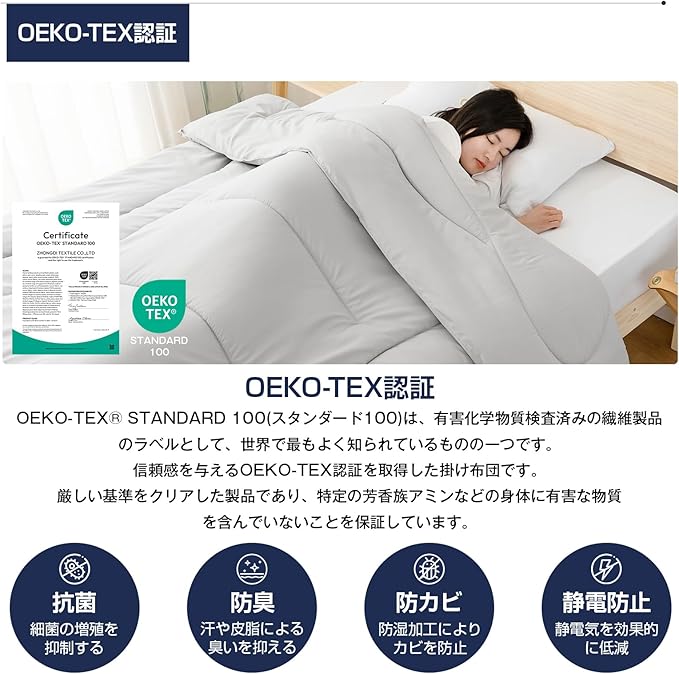 【抗菌防臭加工付き】SEK認証された優れた抗菌防臭加工を施し、細菌の増殖を抑制し付着した汗や皮脂の臭いを抑制するので清潔感を保ち快適に過ごせます。汗をたくさんかく季節でも安心です。確かな管理体制のもとで生産されています。厳しい審査をクリアした国際規格ISO9001認定工場です。お子様がいるご家庭や、アレルギーなどが心配な方におすすめです。