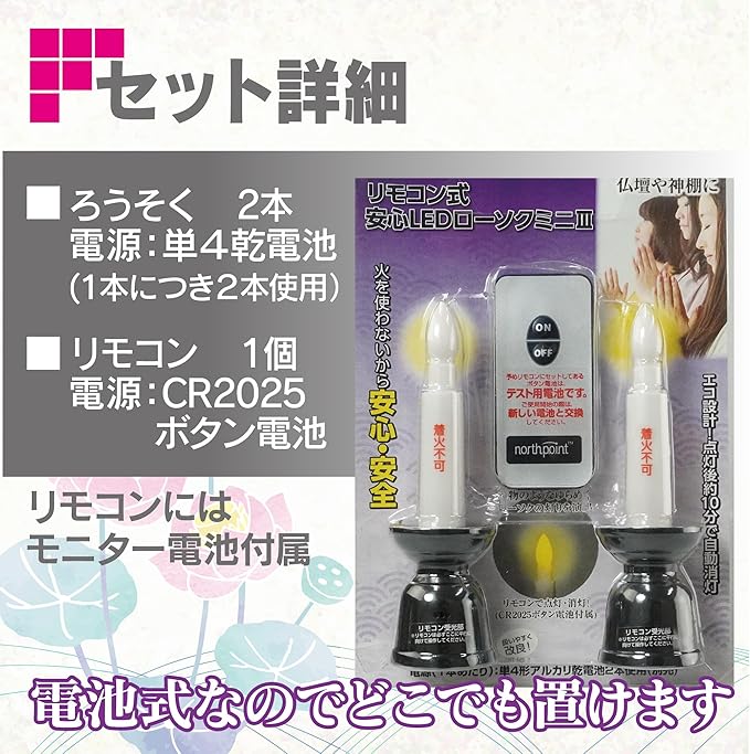 【LEDライトの優しい光がお祈りの気持ちに応えます】火を使わないから燃え移りや火災の心配なく使えるLEDローソクの2本組です。仏壇・神棚での使用におすすめな黒色の台座のミニサイズセットです。