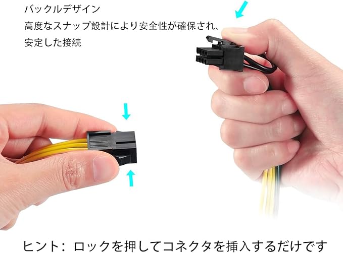 【ラッチ付けの設計】安全な接続を確保するため、脱落防止ラッチ付きのPCIe電源コネクタ,を取外す時にリリースボタンを押す必要があります。