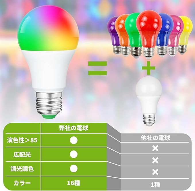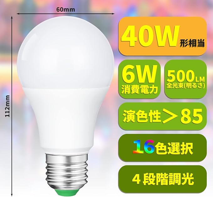 【調光調色】この電球は16色の選択と4段階の輝度調整が可能です。それにより、日常生活に様々なシーンで、違う気持ちに応じて色と明るさを自由かつ簡単に調整することができます。豊富な色彩が異なる雰囲気を醸し出します。