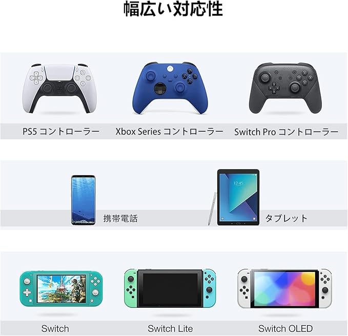 対応機種:PS5 コントローラー、Switch本体、Switchコントローラー、Xbox Seriesコントローラー対応。それ以外、USB Type-Cのスマートフォンやタブレットにも充電・データ転送対応できる多用途ケーブルです。
