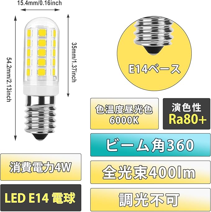 [製品仕様]: 口金E14、調光器非対応、定格消費電力:4W(40W形相当)、色温度:6000K(昼光色相当)、全光束:400lm、LED電球の演色指数は85以上なので、ビーム角:360 、定格電圧:100V 、パッケージ:2個入
