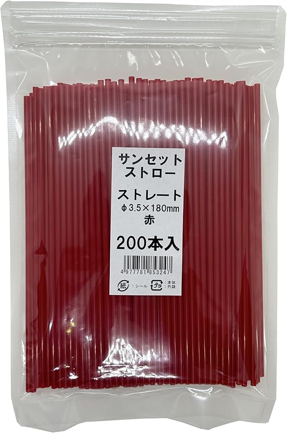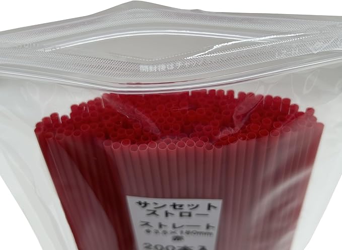 【サンセットストロー】国内生産のストレートストロー口径3.5ミリ長さ180ミリがチャック付き袋に入った商品です。口径が細めのストローで、ドリンクを飲むことはもちろん、カクテル用のステアリングストローとしてもお使いになれます。チャック付き袋に入っているため使わない時はしまっておけるので衛生的です。色は赤色、入り数は200本です。