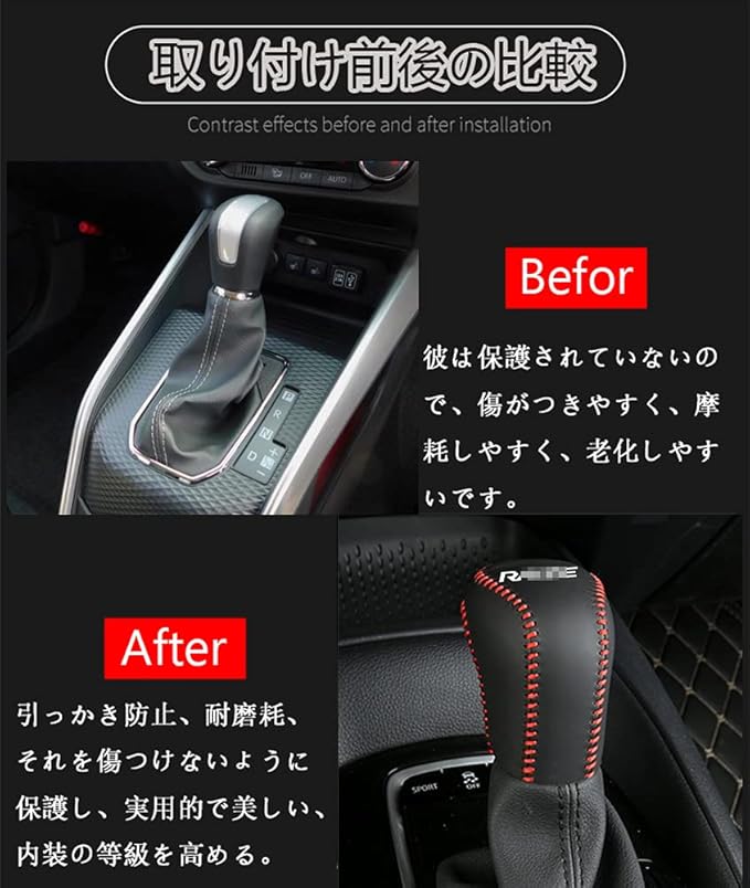 【高級感】:黒+赤ステッチのような凹凸感を出し高級感を醸し出します、シフトノブより目立たせるためのガイドを作成します、スポーティに演出します;使用頻度高いシフトノブに爪などによる傷をもっと防止できます、シフトノブを守ることができます、細部まで上級仕様を実感できます;針糸縫いで取り付けると、取り付けがより強固になります