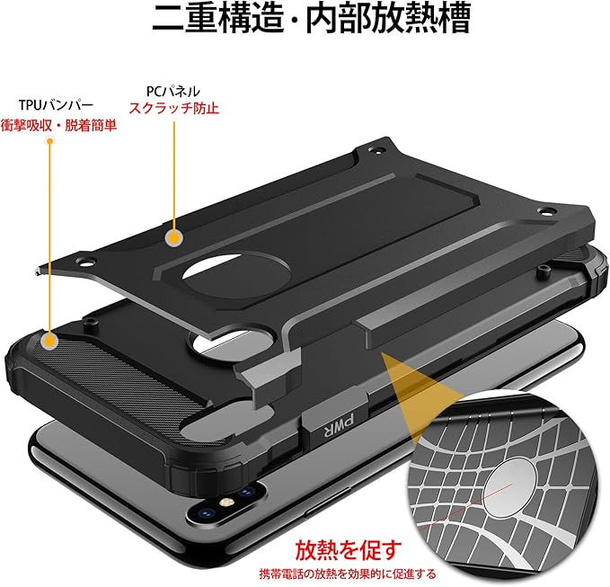 【対応機種】iPhone XS/iPhone X [5.8インチ]専用耐衝撃スマホケースです。【耐衝撃/高品質素材】高品質TPU+PC素材で作られているため丈夫で柔軟性があり、衝撃吸収、落下時に受けた衝撃力を分散させ、携帯電話を有効に保護する。精密カットカットアウトは、すべてのボタンと、スピーカー、カメラ、ホームボタンそして他の部位は完璧にカットアウトして、完全に整列し、すべての機能に完全にアクセスすることができます。【機能性】滑りにくくて持ちやすい、安定的なグリップが特徴です。フィット感で、快適で手触りも良く、指紋や汚れに対する特殊ドコーティング済み、普通のケースより指紋が残りにくいです。【熱循環機能】ケース内部に微細段差構造設計を採用し、熱を循環させ、デバイスの性能を安定的に維持できます。【安心感がある品質保証】30日品質保証期間、万が一、商品に関する問題がございましたら、メールでご連絡してください。状況確認してから、無料再送、又は返金対応致します。