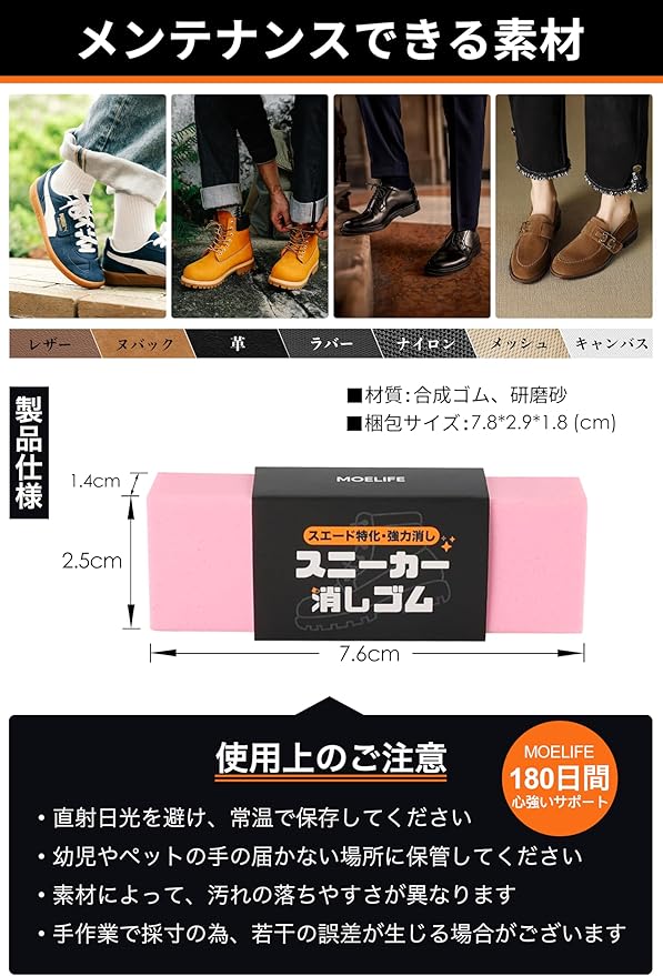 【スエード特化・強力消しパワー】研磨剤を混ざっており、スエード、ヌバックなどの起毛素材についた汚れを簡単に取り除くことができます。普通の消しゴムと比べて、消しパワーがアップしており、より効果的に汚れを落とします