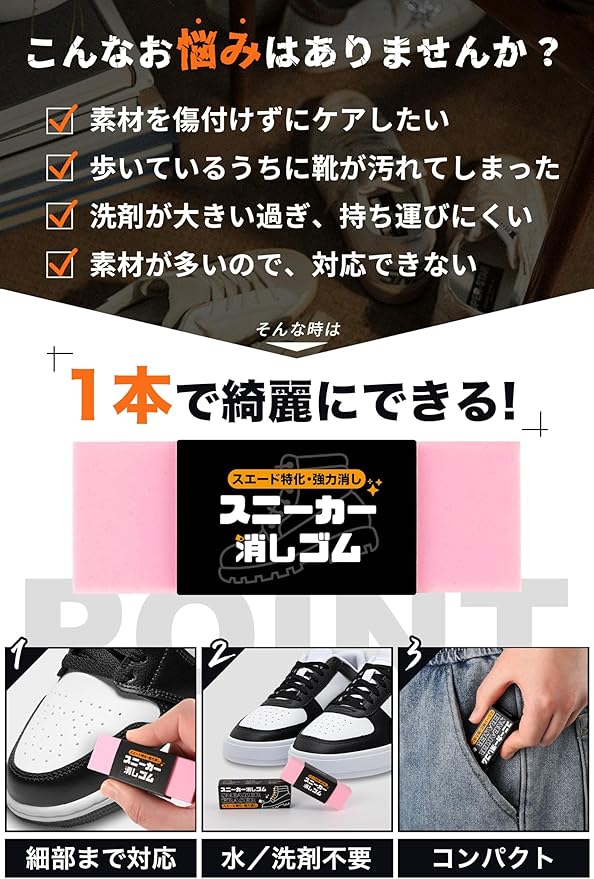 【水/洗剤不要・手軽に使える】水も洗剤も要らない手軽なスニーカークリーナーとして、気になる部分をサッと擦るだけで汚れを落とします。また、靴のアッパーだけでなく、先ゴム、廻しテープ、ヒールパッチなどの細かいところの汚れも簡単に取り除きます