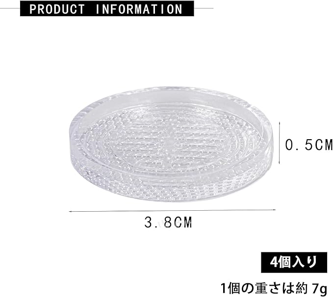 1.【商品仕様】サイズ:約3.8 3.8 厚さ0.5cm(各)、適用内径10~35mm、重量:7g(各)、数量:4個、最大荷重500kg。 2.【色透明と適用性が強い】ソファーの滑り止め色は透明で、各種の家具や床と融合しても違和感がありません。 3.【高品質素材】シリコン系素材の柔らかいタイプなので、長時間使用しても、床に跡やベタつきが残らない。シートの裏面がエンボス加工で効果的に力を分散します。 4.【簡単操作】使用時はソファーの脚と床の間に挟むだけで、簡単に逸脱の問題を解決でき、また床の傷も防げます。 5.【防音性】シリコン性で弾力があるため、振動や騒音をしっかり吸収してくれます。
