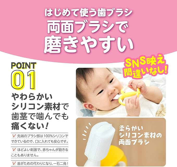 かわいいバナナモチーフの歯ブラシ。磨きやすい両面ブラシは、歯ぐきで噛んでも痛くないやわらかいシリコン製です。歯の生え始めのお子様の歯ブラシデビューにご使用いただけます。