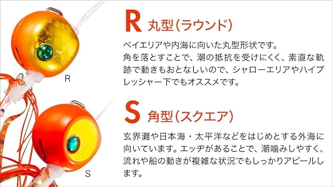 R=丸型(ラウンド)はベイエリアや内海向け。潮の抵抗を受けにくく素直な軌跡で動きもおとなしいので、シャローエリアやハイプレッシャー下でもおすすめ。