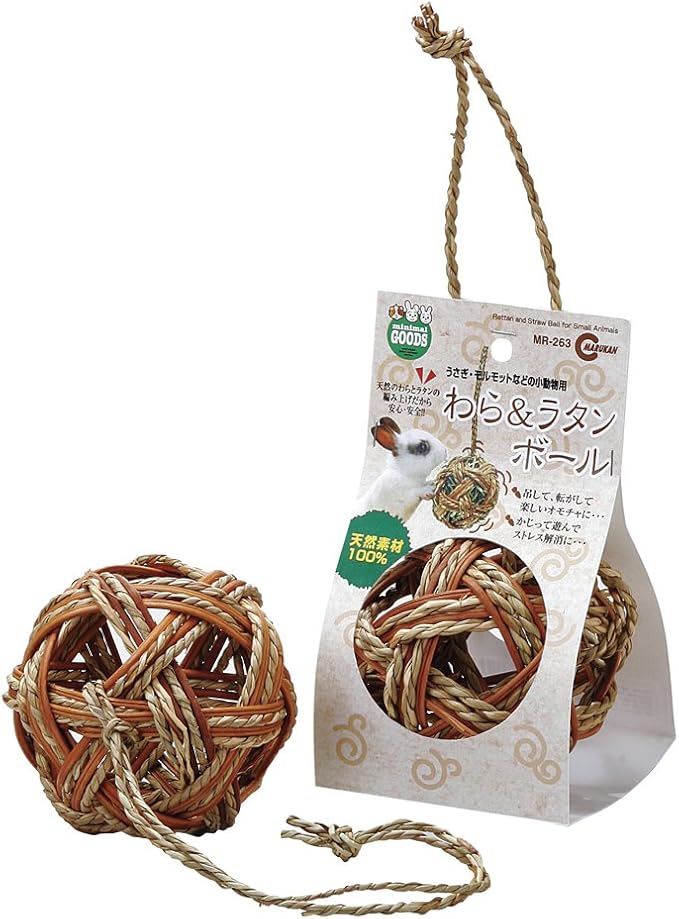 天然のわらとラタンの編み上げだから安心・安全です。またボールの中に、牧草を詰めて与えることも出来ます。