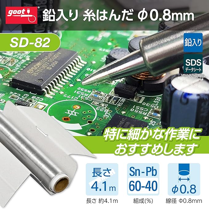 精密プリント基板用 鉛入りはんだ φ0.8mm スズ60%/鉛40% ヤニ入り SD-82 日本製
