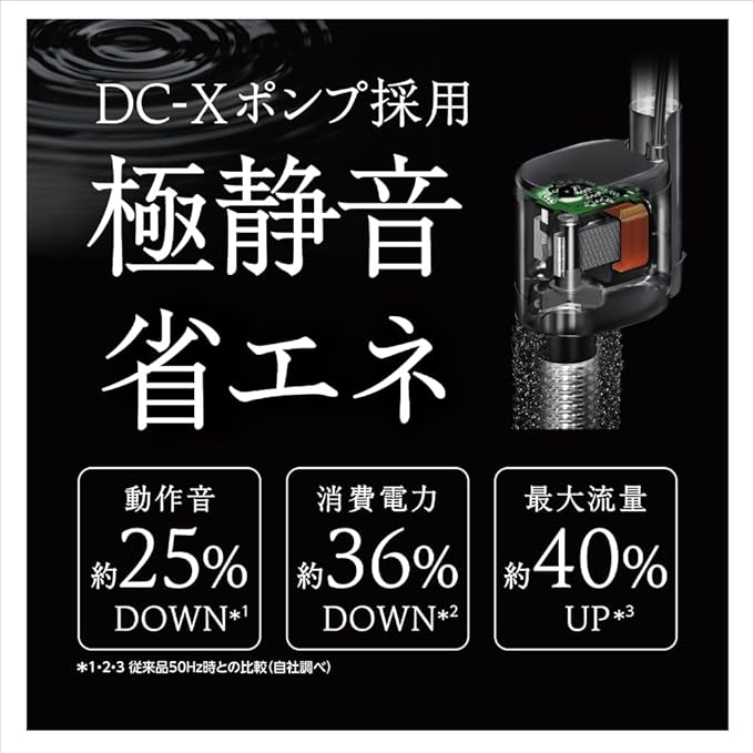 DC-Xポンプ採用。ろ過性能UP、極めて静音&省エネ化。 奥行スリムタイプだから水槽まわりすっきり。