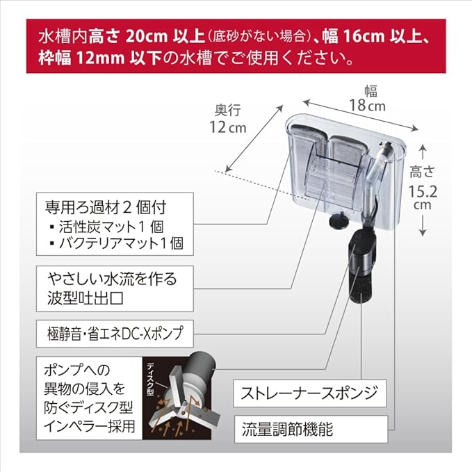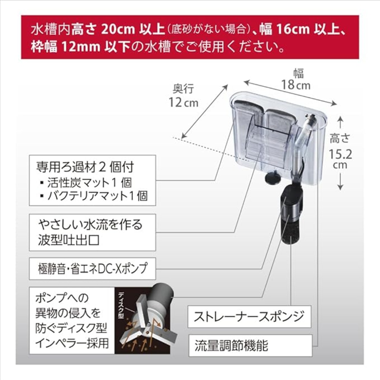 ●水容量25L以下の水槽用としてご使用ください。●水槽内高さ20cm以上(底砂がない場合)、水槽内幅16cm以上、枠幅12mm以下の水槽でご使用ください。 ※本製品は屋内観賞魚飼育専用です。他の目的・屋外では使用しないでください。※海水水槽で使用する場合は、塩分や汚れをこまめに拭き取ってください。※底砂の種類・粒サイズによっては、水流で底砂が舞う場合があります。
