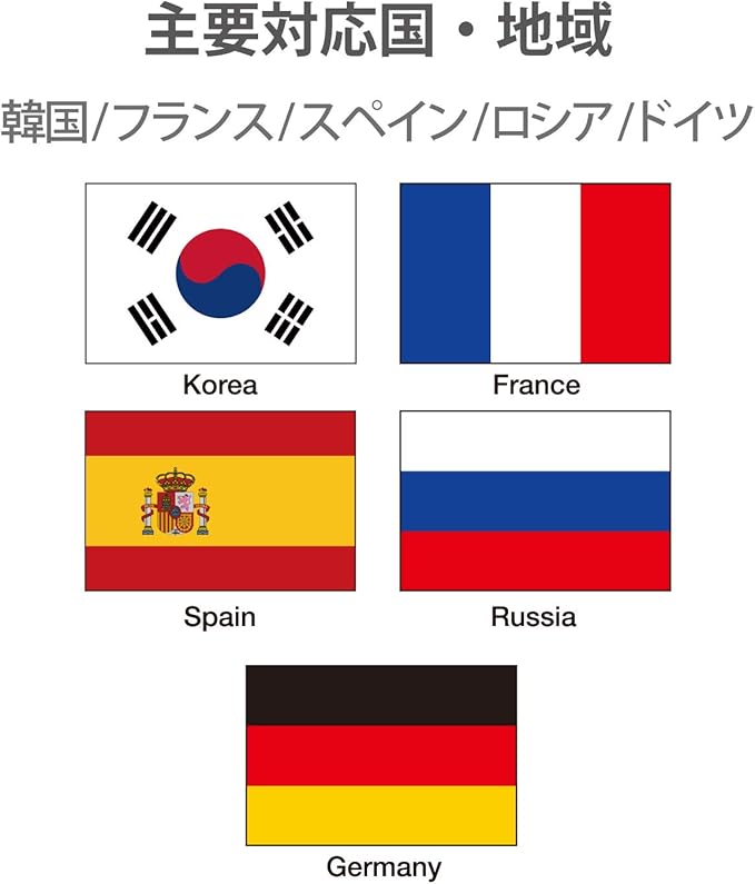 ●海外の形状のコンセントプラグを日本国内で使用するための、安全設計を採用した変換プラグです。●韓国、フランス、ドイツ、スペイン、ロシアなどから来日された方向けの、SEタイプ変換プラグです。●プラグが使用されている主な国、地域の旗をパッケージに表示し、どのプラグが適応するかお客様が選びやすくしています。●多言語パッケージを採用し、海外からのお客様にもわかりやすくしています。●製品本体には耐熱性に優れた難燃性ユリア樹脂を使用しています。●万一の発熱の際にも溶解しにくく、電気火災の防止に有効です。●日本の電気用品安全法(PSE)の技術基準に適合した安全性の高い商品です。●※この製品は日本国内での使用を前提に製造されたものですので、日本国外ではご使用いただけません。●※本製品では電圧を変えることはできません。日本の電圧に対応していない電気製品をご使用の場合は旅行者用変圧器等とあわせてご使用下さい。●※国や地域によってコンセント形状が異なります。予めお手持ちの機器をご確認下さい。