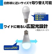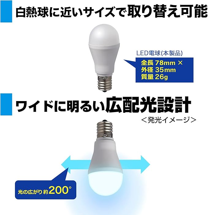 ■交流電源:100V 50/60Hz共用 ■口金:E17 ■サイズ:全長78X外径35(mm) ■質量:26g ■定格消費電力:2.3W ■定格入力電流:45mA ■設計寿命:40000h ■全光束:255lm ■エネルギー消費効率:110.8lm/W ■光色:昼光色相当 ■屋内用