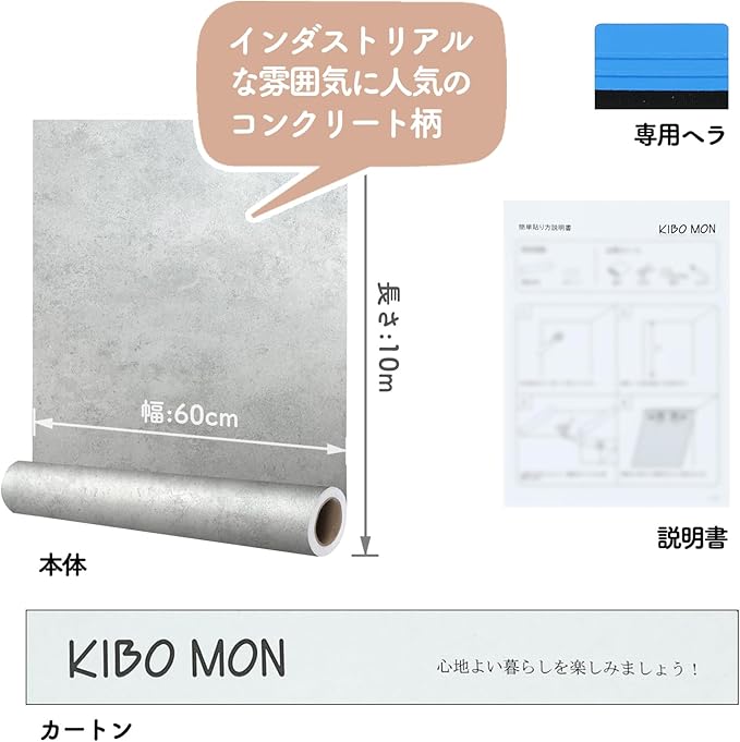壁紙 コンクリート 壁紙シール コンクリート壁紙 ライトグレー 打ちっぱなし リメイクシート コンクリート調 剥がせる壁紙 はがせる 幅60cmx10m KIBO MON 初心者・女性一人でもOK ツヤなし 模様替え 防水防汚 DIY 賃貸OK