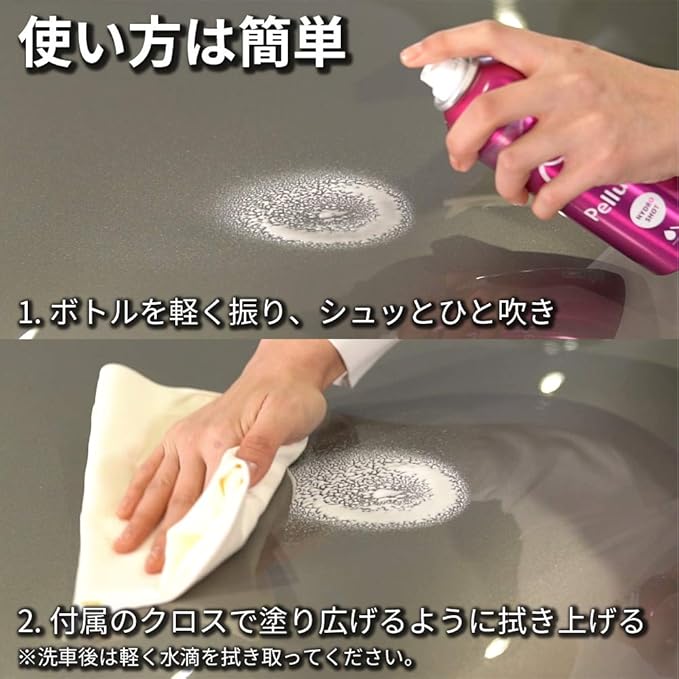 スプレーして付属のクロスで拭くだけ。ペルシード ハイドロショットは、塗装表面のクリア層そのものをガラス質に変える、浸透型の次世代コーティングです。塗装を研磨しない限り効果が続きます。
