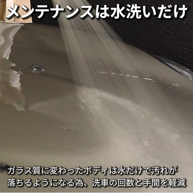 驚異的な水切れ 優れた親水効果で、気持ちいいほど水が引きます。 メンテナンスは水だけ ガラス質に変わったボディは水だけで汚れが落ちるようになるため、洗車の回数と手間を減らすことができます。
