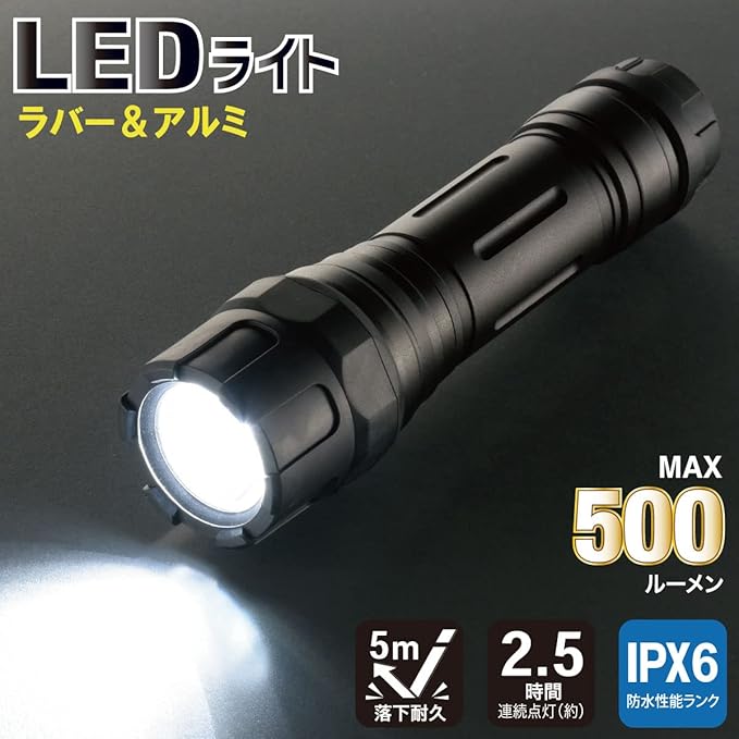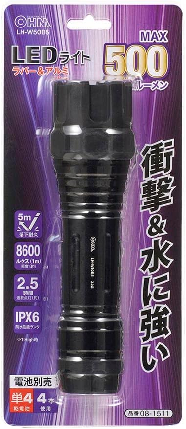 オーム電機 懐中電灯 LED 防水 耐水 照度8600ルクス 衝撃に強い アウトドア ハンディライト LEDライト ラバー&アルミ 500ルーメン LH-W50B5 08-1511 OHM