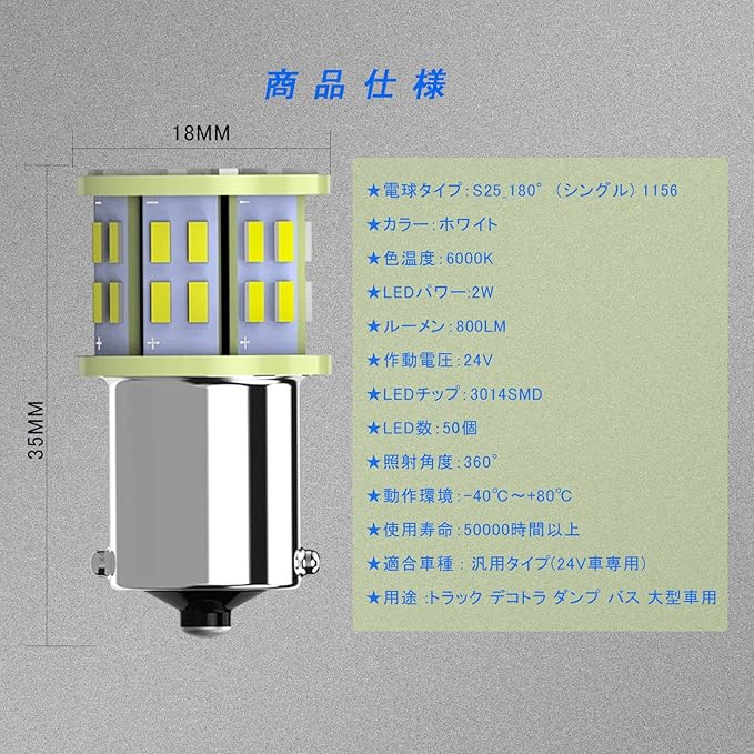【高輝度LED搭載 】: 24V車用S25シングル/G18 (1156 BA15s) LED電球は、50個の高輝度LEDチップを搭載しており、抜群の明るさを提供します。トラック、デコトラ、ダンプ、バスなどの大型車両の視認性を大幅に向上させます。