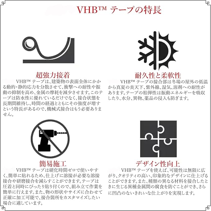 VHB構造用接合テープは接着剤、ビズ、ボルト、スポット溶接に代わる新世代の接合技術です。簡単な作業で強力な接合、しかも美しい仕上がりが実現します。当商品はより凡庸性の高いサイズのダイカットに加工し特価にてご提供しております。