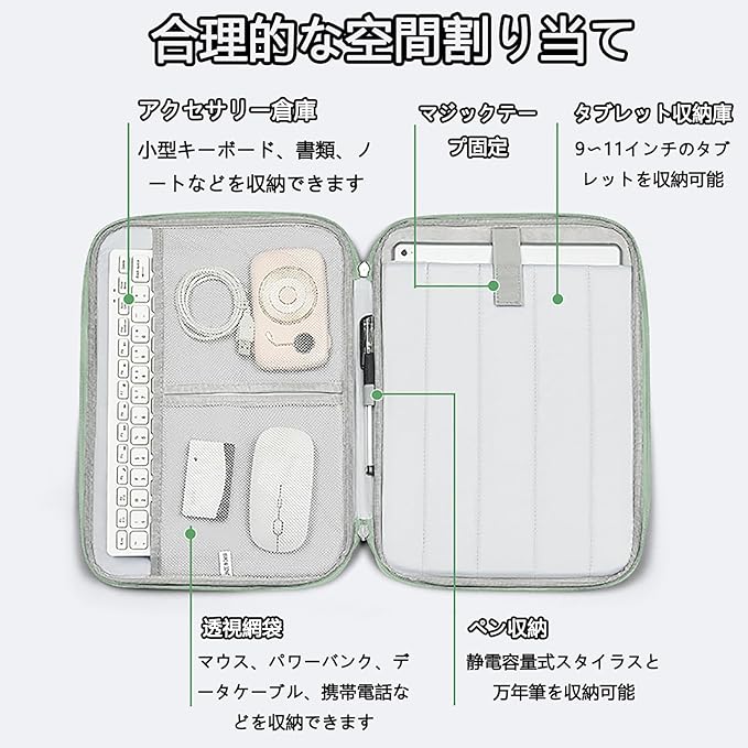 【多機能収納】区画設計、内部空間を十分に利用し、iPadを収納できるだけでなく、複数の仕切りを備え、タブレット、充電器、データケーブル、イヤホン、ノートなどを簡単に収納し、品物が整然として秩序正しく、必要な品物を迅速に取りやすくする。