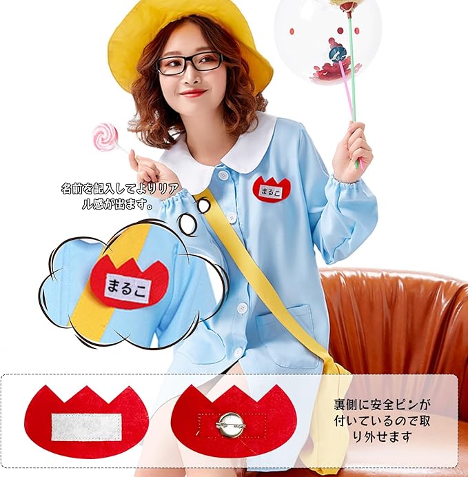【リアル感満々】:幼稚園児コスプレ服装の帽子とバッグは同じ派手な黄色で存在感も充分にアピールできます。バッグに物を入れたりもできるので実用性も兼ね合います。名札は可愛い赤チューリップ型で、白い部分に名前や組を入れられるように、よりリアル感を演出します。