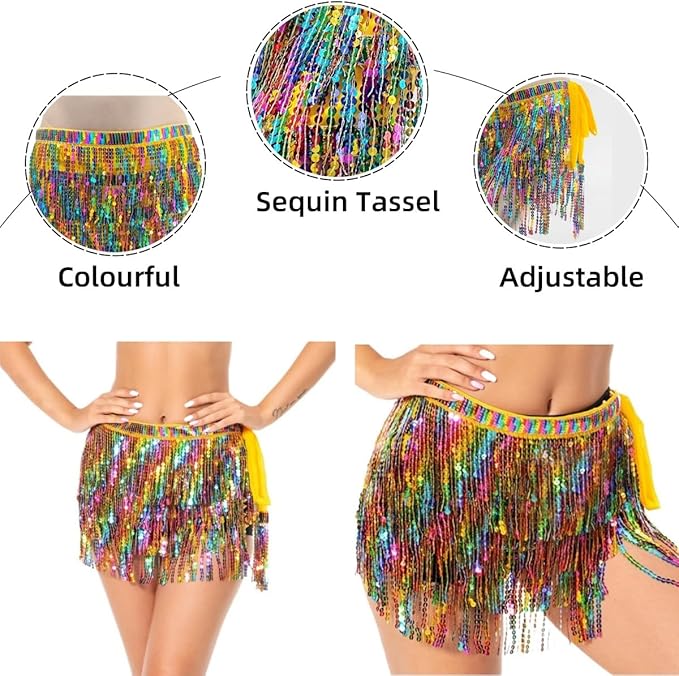 [Getrays] 女性用シークインタッセルスカート、グリッターが光るフリンジつきベリーダンスヒップスカーフドレス、4 層タッセルのミニレインボーラップスカート フェスティバル、ダンスパフォーマンス、メタリック風レイブパーティーに最適なベルト付き衣装 | etshop