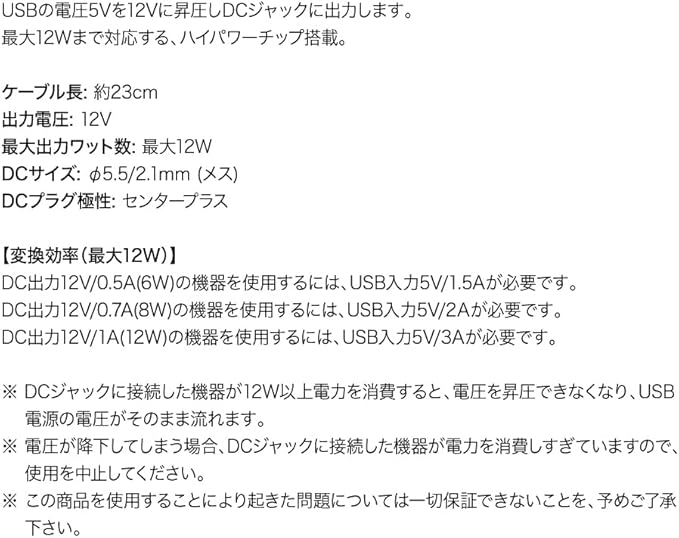 USBの電圧5Vを12Vに昇圧し、DCジャック(φ5.5/2.1mm)として出力します。