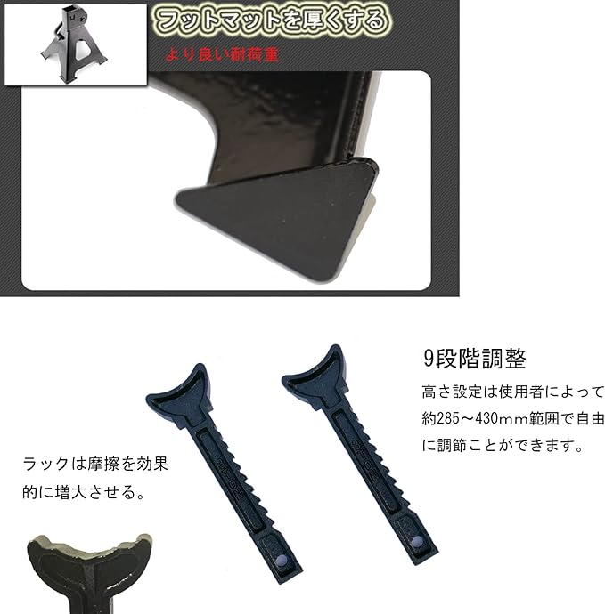 【高さ調節可能】高さ設定は使用者によって約285~430mm範囲で自由に調節ことができます。(ジャッキスタンドの高さは個体差があり、実物によって少し違いますが、使用には影響がないのでご安心ください。)レバーが上に上がると、ラチェットの高さを調整。初心者でも簡単に使用できます。
