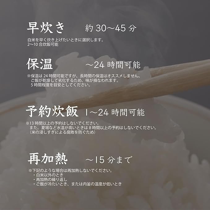 ■商品仕様 定格:AC100V 50/60Hz 消費電力:850W 重量:約3.8kg コードの長さ:約1.15cm 外径寸法:(W)27.5 (D)40.0 (H)26.0cm 最大炊飯器(白米):5L(一升) タイプ:マイコン式 内窯:アルミ、フッ素コーティング メニュー:白米・無洗米・玄米・お粥・炊きこみご飯・スチーム調理・雑穀米・再加熱 予約:1時間~24時間(10分刻み) 保温:24時間