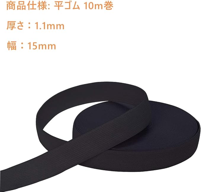 【商品仕様】織ゴム 10m巻。 幅:15mm 厚さ:1.1mm。 カラー:ブラック