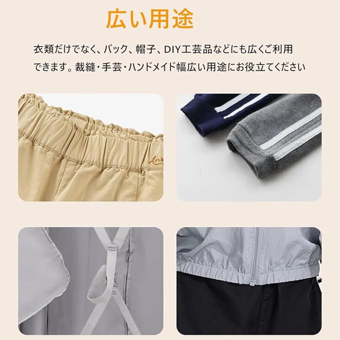【広い用途】袖口、ウエストバンド、ズボン、スポーツウェア、下着、ドレス、スカート、ベルトにはいい選択です。衣類だけでなく、バック、帽子、DIY工芸品などにも広くご利用できます。裁縫・手芸・ハンドメイド幅広い用途にお役立てください。