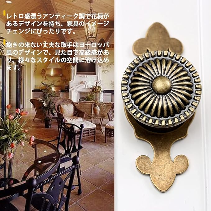 【レトロな設計】このノブは、亜鉛合金の材料で作られ、レトロ感漂うアンティーク調で花柄があるデザインを持ち、家具のイメージチェンジにぴったりです。