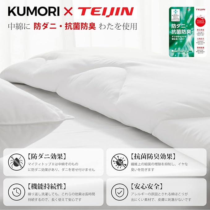 【抗菌・防臭・防ダニ】中わたには、防ダニ・抗菌・防臭性に優れた帝人「マイティトップII」を50%使用。細菌の繁殖を抑制して嫌な臭いを防ぎ、ダニを寄せ付けません。