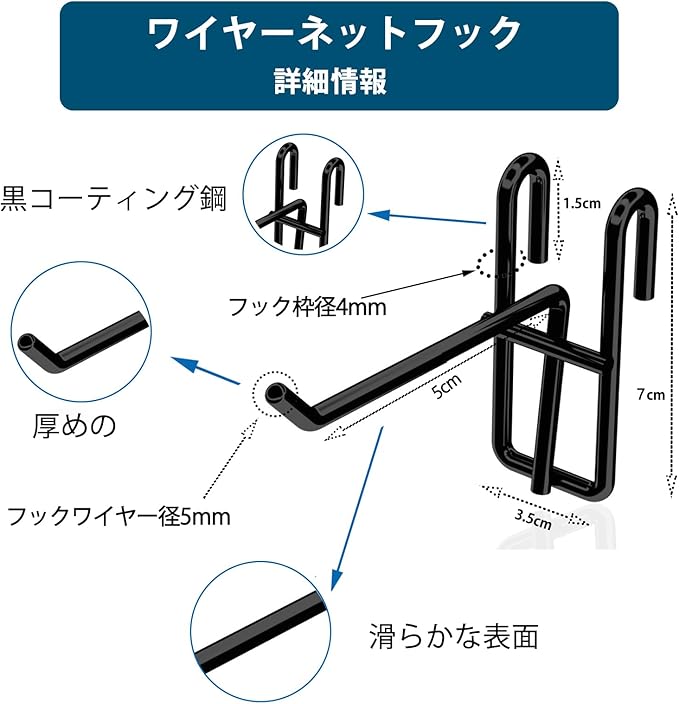35個 メッシュ パネル フック ネットフック ワイヤーネットフック 黒 50mm ネットフック ブラック メッシュパネル フックメッシュ ネット用 フック ラック用フック ワイヤーフック メタルラック フック パネル フック スチール製 ワイヤーネット ラックフック ネット 網 フック 商品陳列 展示 ディスプレイ 収納に 壁面収納 (フックワイヤー径5mm フック枠径4mm) | etshop