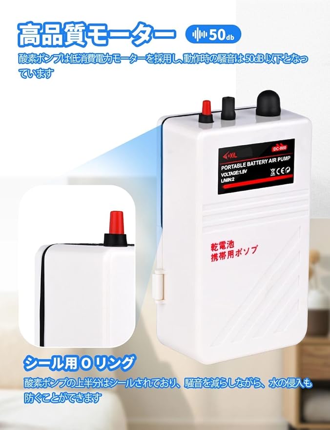 【大きい吐出量/乾電池で駆動】エアーポンプの最大吐出量は2L/minで、水深60cmにおすすめします。本体重量:約155g。単1型乾電池2本で駆動(乾電池1本でも動作可能)、電池交換するにはネジを外す必要なくてとても便利です。付属品にはチューブ、ストーン、逆流防止弁、防水収納袋が入っています。