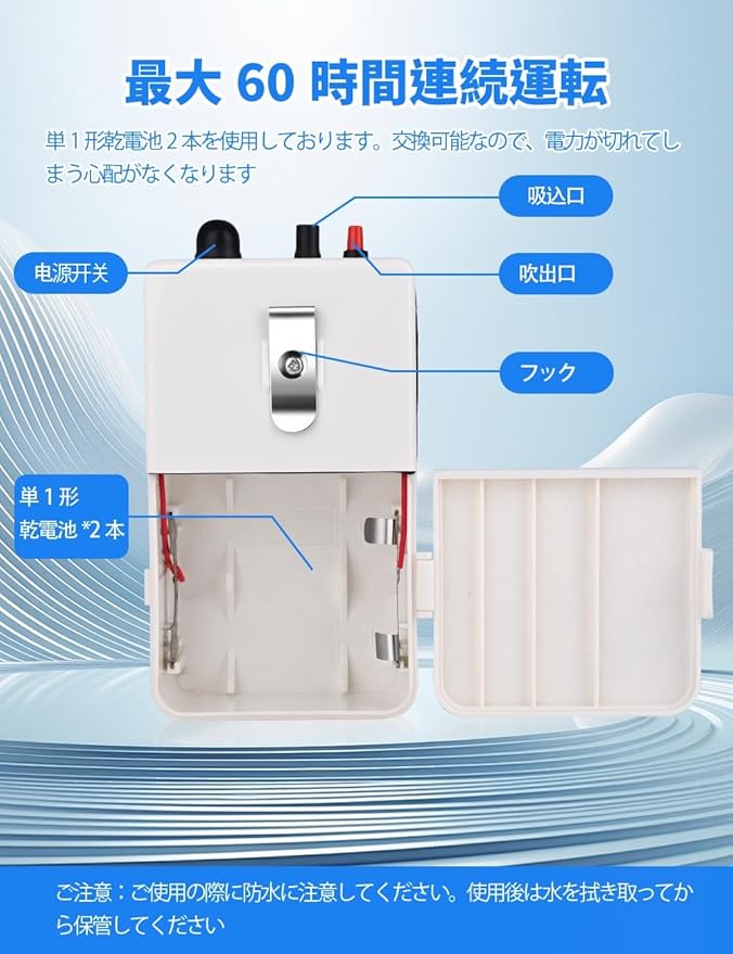 【アウトドでお釣り】エアポンプには付属品が揃っています。乾電池だけをご購入になれば、ご利用いただけます。サイズ小さくて、防水収納袋も付属されていて持ち運び便利です。エアポンプに金属フックが付属されています。バケツやタックルボックスに掛けることができ、屋外でお釣り用に適します。