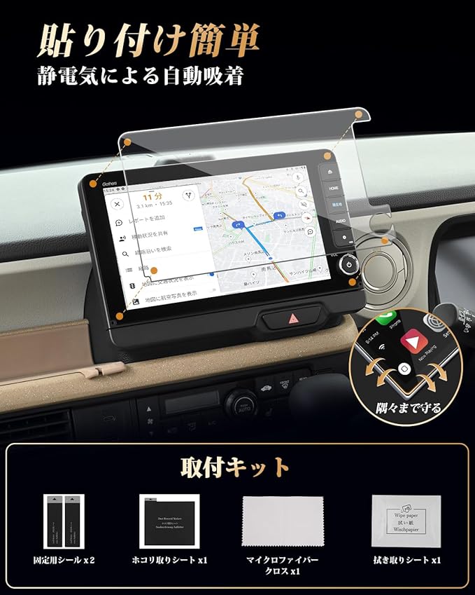 【簡単貼り付け、気泡防止設計】 付属のツールを使い、手順に従って数分で安全な画面保護を施せます。 ※気泡の原因となるホコリや汚れを取り除くため、取り付け前に画面をよく清掃してください。また、車内へのホコリの侵入を防ぐため、窓を閉めた状態での作業をおすすめします。気泡が残った場合は、軽く押し出すことで簡単に取り除けます。