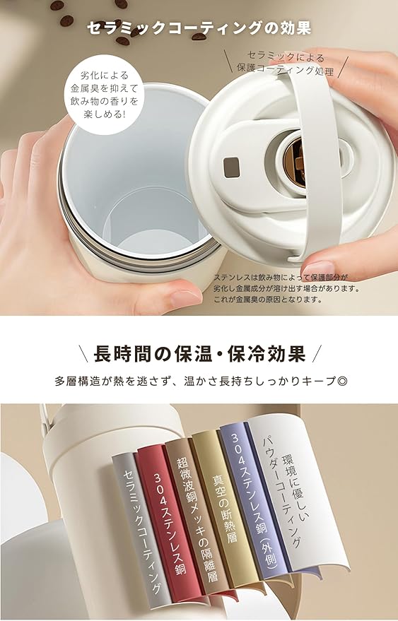 【セラミックコーティングで飲み物本来の味わい】内側の特殊セラミック加工により金属特有の臭いを防ぎ、コーヒーや紅茶の繊細な香りをそのまま楽しめます。陶器のようななめらかな口当たりで、毎日の水分補給がより快適になる高品質タンブラー