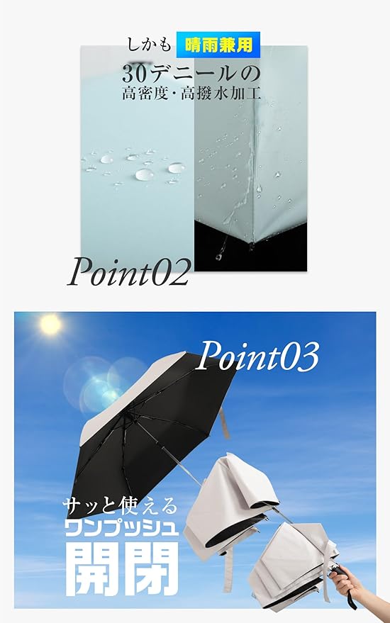 ☂【晴雨兼用*耐風撥水】310T高密度の撥水加工材料で作られ、雨が珠のように丸くなり転がり落ちます。普通の傘より撥水性が優れ、軽く振るだけで雨水を振り払えます。長い間使用しても雨の染み込みが気にならなくなりました。電車内等の公共の場では人にご迷惑を掛けません。また防汚効果もあり、汚れにも強い生地です。中棒は頑丈航空機用アルミ合金製造、6本の傘骨にグラスファイバーと航空機用アルミ合金を使用しました。耐久性に優れています。強風で裏返っても元に戻ります。