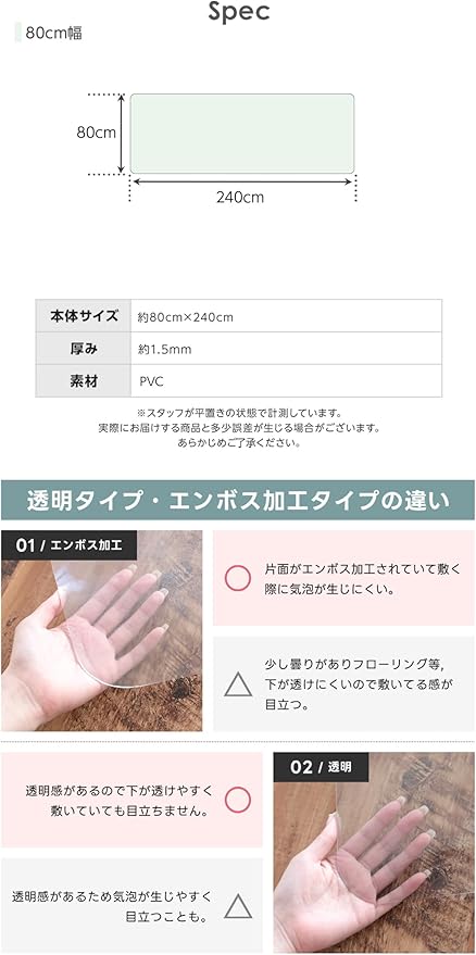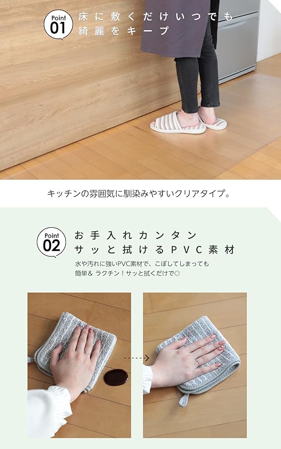 自由にカットできる透明キッチンマット。 PVC素材なのでサッと拭くだけで簡単にお手入れできます。 キッチンの雰囲気に馴染む透明デザイン。 エンボス加工で滑りにくいのも◎ 耐熱加工なので床暖房にも対応しています。