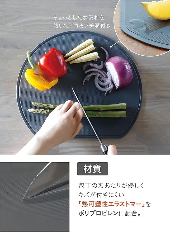 ポリプロピレンに「熱可塑性エラストマー」が配合されているので、適度な硬さと程よい弾力があるのが特徴。包丁の刃あたりが優しいので、食材が切りやすく刃こぼれを防ぎます。まな板自体にも深いキズが付きにくいので安心です。