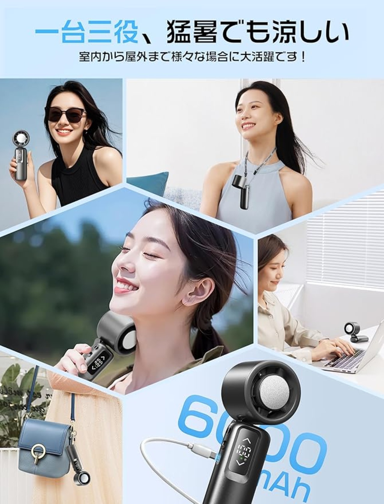 【静音設計 熱中症対策に最適】長寿命で運転音が静かなDCブラシレスモーターを採用、動作音が小さく省エネにもなります。スマホよりも軽い約250gで、バッグに入れて持ち運びも簡単です。 いつでもどこでも使用できます。真夏のフェスやアウトドア、スポーツ観戦、散歩、山登り、遠足、お祭りや日常生活でのガーデニング、お化粧時、家事の時、通勤、通学、オフィスなどあらゆる場面で活躍するアイテムです。
