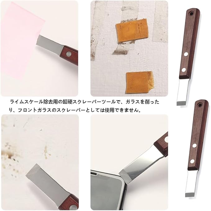 "【使いやすさ】ポリッシュバー ヘラ持ちやすいハンドルで、手になじみ、力を入れやすく、長時間の作業でも疲れにくいです。軽量で持ち運びやすく、コンパクトサイズで収納に便利です。【製品材質】スクレーパーはハードな作業に耐える高品質の材質で作られており、先端は精密な作業のために鋭利で平らです、お掃除ヘラ耐久性と機能性は耐久性と優れた結果のために厳しくテストされています。【幅広い用途】この水垢落としは多用途に使用でき、シャワー室の落ちにくい接着跡や水垢、洗面台や蛇口周りの頑固な汚れを洗浄でき、日常清掃、大掃除、特別なメンテナンスにおすすめです。 ライムスケール除去用の超硬スクレーパーツールで、ガラスを削ったり、フロントガラスのスクレーパーとしては使用できません。【注意】作業する時、工具に注意し、表面に傷を付けないように力加減に注意し、使用する時、目の保護に注意し、他の物質が目に入らないようにする。パッケージ内容(7点セット)木製ハンドルのり除去スパチュラ 2ワイヤーブラシ 1ワイヤーブラシ 1ナイロンブラシ 1ストレートスパチュラ 1カーブスパチュラ 1"
