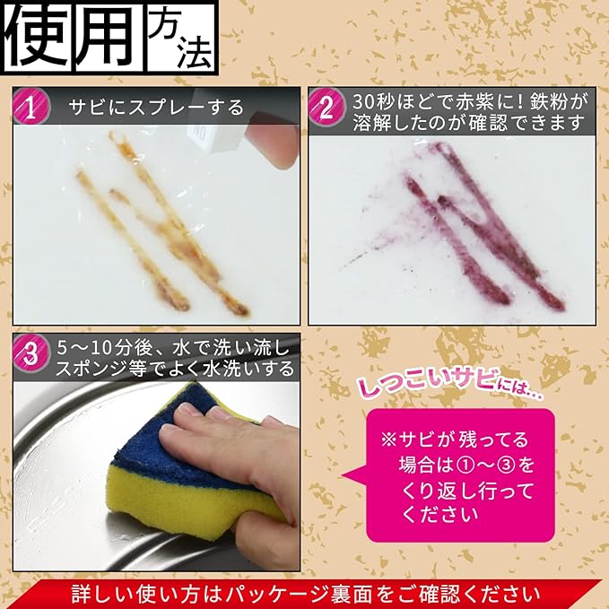 使用上の注意:材質に染み込んでいるザビは取れない場合がある。必ず目立たないことろで試してから使用する。換気の良い場所で使用する